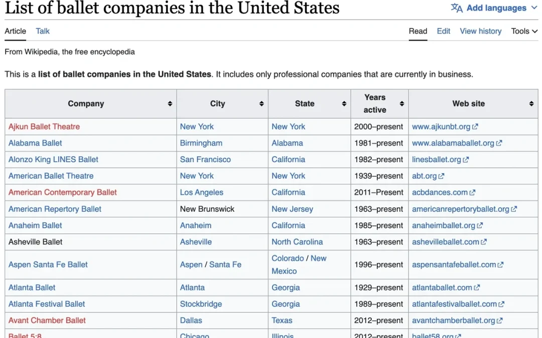 List of Ballet Companies in the United States by Samantha | Dec 9, 2025 | Others | 0 comments MBB has located a list of ballet companies across the US. Here’s the link: Ballet Companies Submit a Comment Cancel replyYour email address will not be published. Required fields are marked *Comment * Name * Email * Website Save my name, email, and website in this browser for the next time I comment.