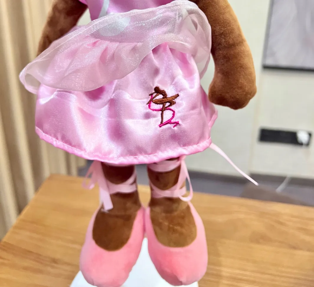 She also has our detailed logo monogramed on her little dress. Â She has ballet “pointe” shoes that lace up and a bow atop her head. Â She will make the perfect gift for your little dancer!